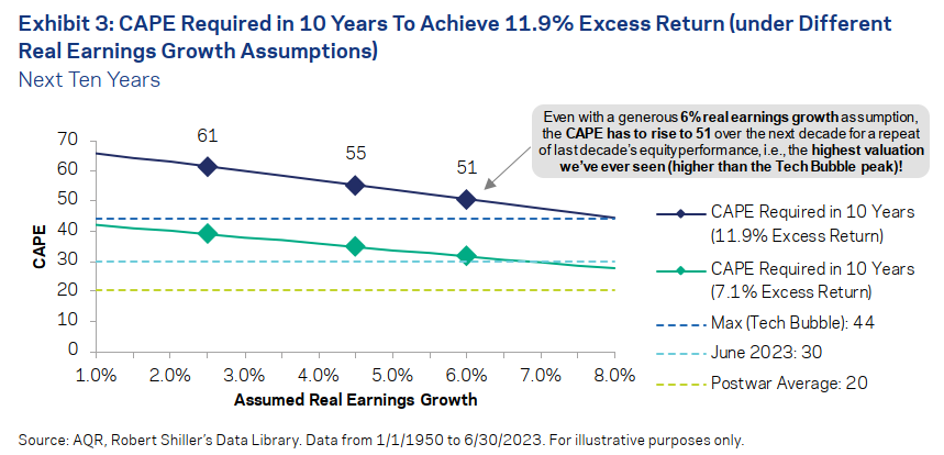 Along those lines, Jordan Brooks of AQR penned a report, “Driving with the Rear-View Mirror,” which looks at the elements of equity returns (Excess of cash return = Dividend yield + Real earnings growth + Multiple expansion – Real cash return), to answer the question, “Will we see a repeat of the past decade of U.S. equity returns?”