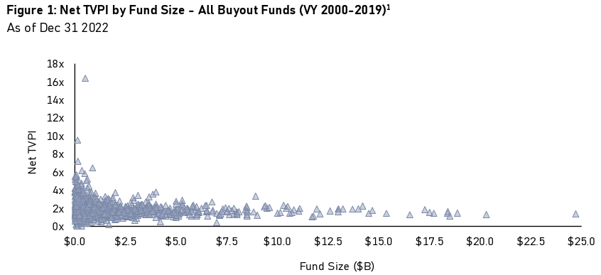 The image above, charting net total value to paid-in capital by fund size, illustrates the rationale in terms of historical performance, which is further demonstrated in additional exhibits. The focus is on the greater upside potential of smaller funds, although, “Left tail risk, that is, underperformance or loss of capital, appears more common with small funds.”