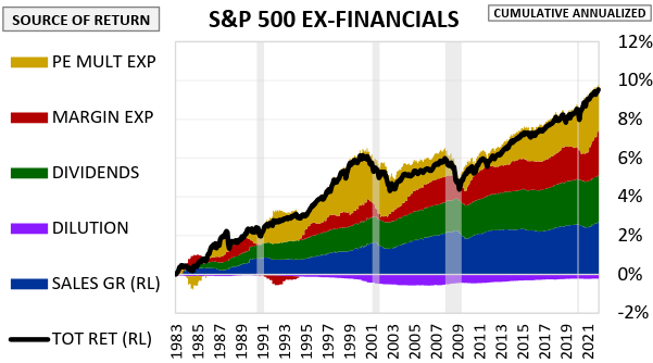 It’s quite remarkable that the four main components — sales growth, dividends, margin expansion, and multiple expansion — were so close together in impact, with each one contributing between 2.31% and 2.69% to the aggregate real return of 9.54%.