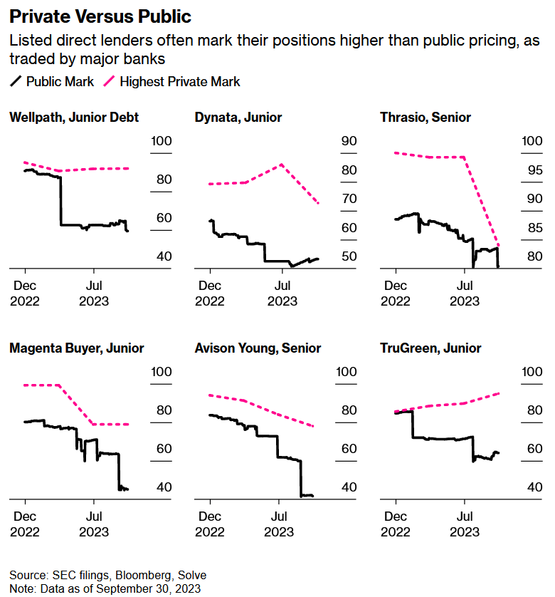 Of great interest is a recent Bloomberg piece, “Flawed Valuations Threaten $1.7 Trillion Private Credit Boom,” which includes the above illustrations. The gaps speak for themselves.