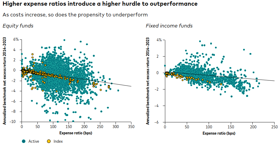 Of course, paying higher fees makes it harder to achieve benchmark returns, to say nothing of benchmark-plus ones. To wit: