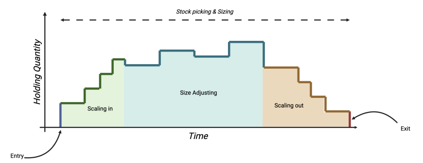 The image above was chosen from the paper because it clearly shows specific decisions to add, subtract, or hold shares of a position over time. This often gets lost in evaluations based upon the weight of a security within a portfolio, which is affected by other factors in addition to those specific decisions. Incorporating a graph like this with one depicting the portfolio weight paints a much clearer picture of decision making.