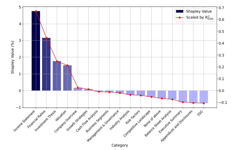 Using more than a hundred thousand analyst reports, the author tapped the large language model to address a variety of questions, including assessing “how much each topic within the reports contributes to explaining stock returns.” That ranking is pictured in the chart above.
