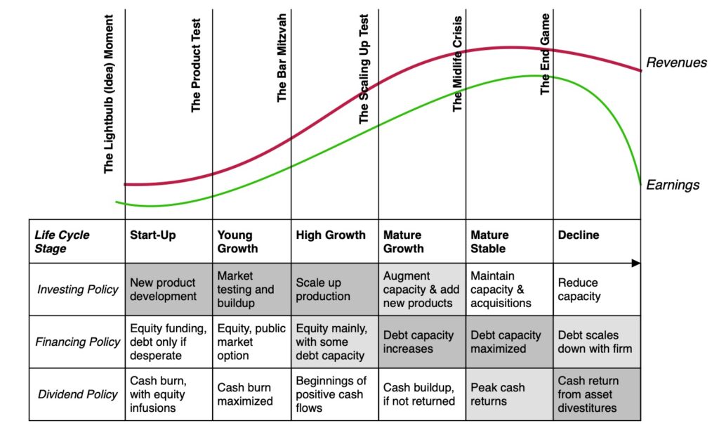 Not quite a unifying theory, Damodaran uses the corporate life cycle (a concept more common to research in management and strategy than to finance) as the organizing principle for the book, writing that “while it is neither new nor the answer to all questions in finance, it has a surprisingly comprehensive explanatory power.”