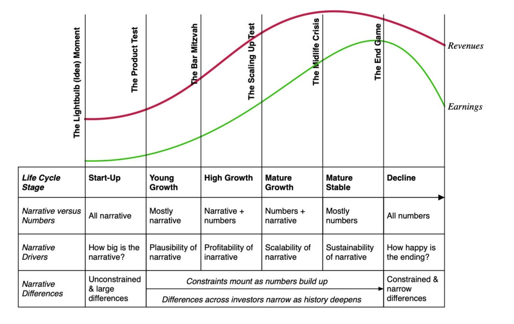The author of an earlier book called Narrative and Numbers, Damodaran has always stressed that a good valuation is “a bridge between stories and numbers,” that to estimate the drivers for a valuation, you need a narrative about the business in question. Here’s a summary of how the mix of narrative and numbers changes across time: