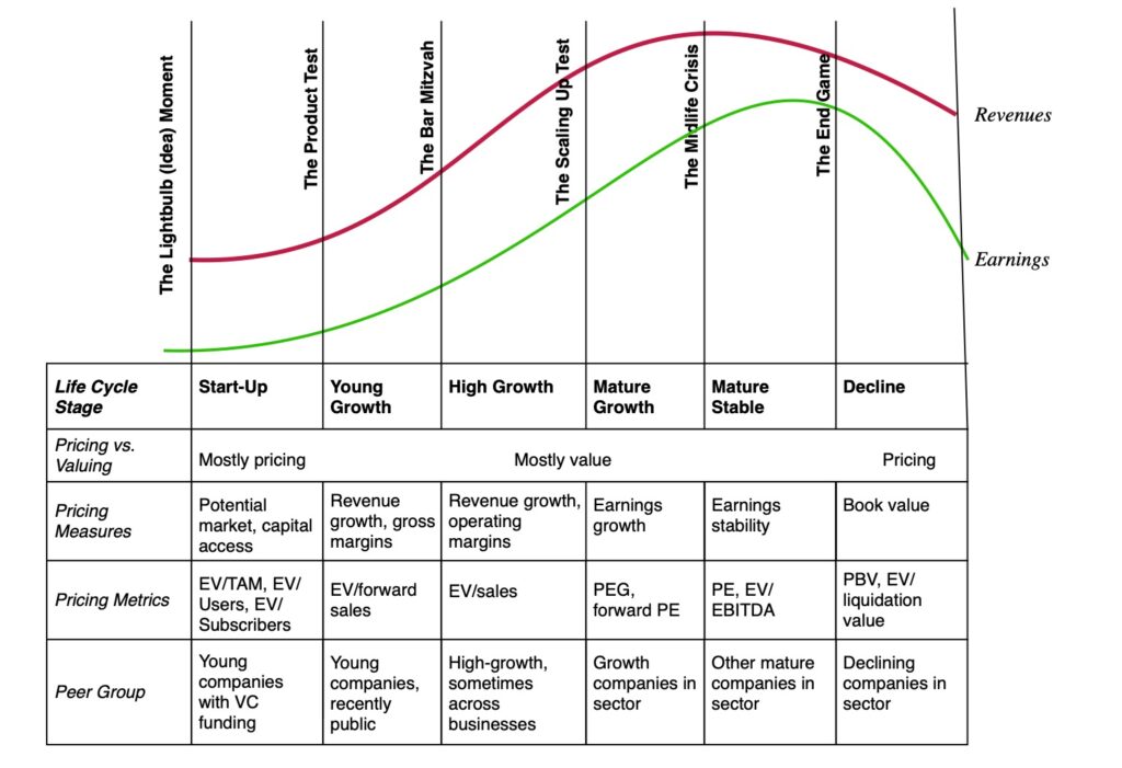 Estimation challenges are different at each stage of the life cycle. An analyst needs to arrive at a valuation that makes sense given the available numbers and the narrative she thinks best describes where the company is and will be. All the while, the market is providing signals of its own: