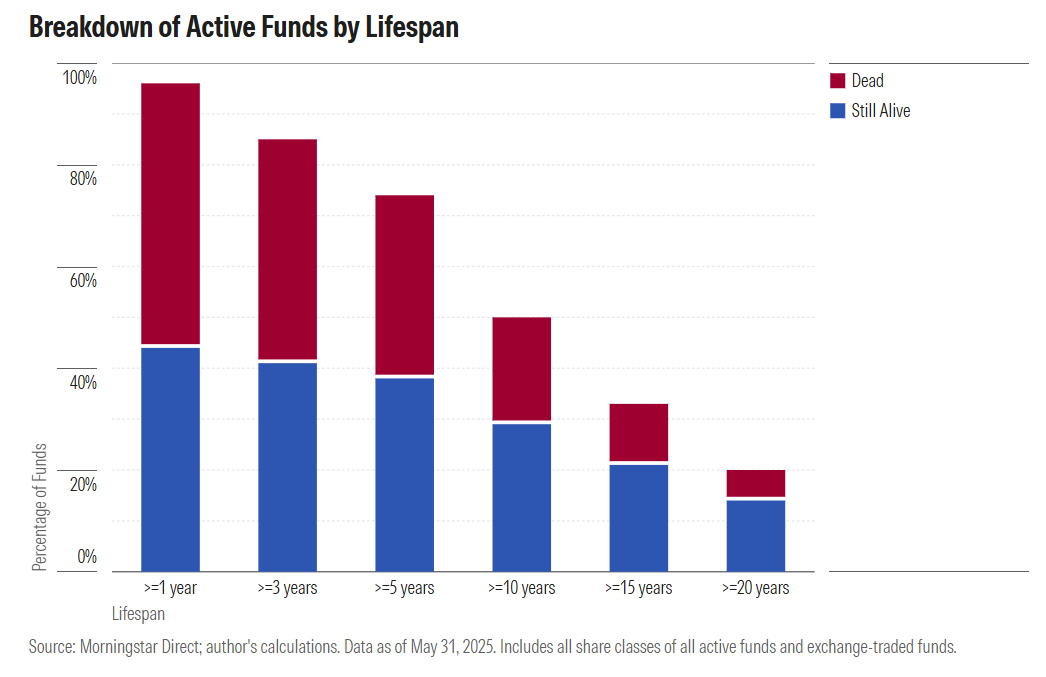 The second reason Ptak cites is fund mortality. Just when the reversion could move back in a positive direction, the fund sponsor might pull the plug. The chart above documents the lifespans of all funds (ever) that have been in existence at least as long as the time periods shown. So, only about half have lasted ten years or more. Of those that made it that far, about a third are no longer with us.