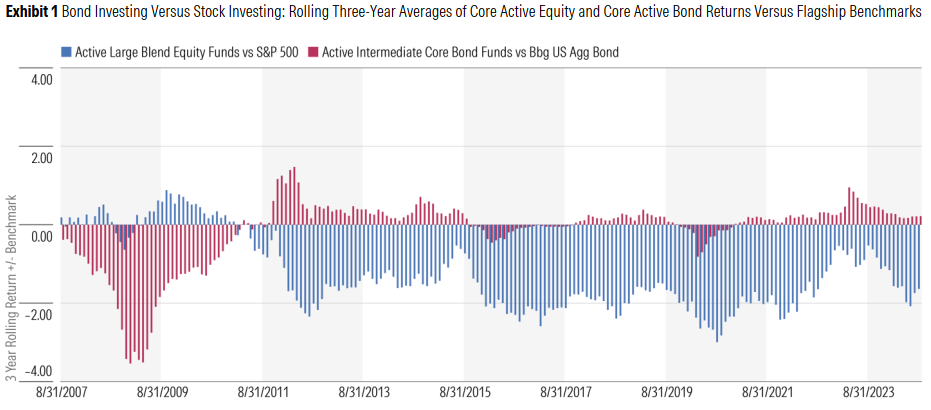 This chart, one of many in the report, shows the pervasive underperformance of equity funds over the last fifteen years and the frequent, if modest, outperformance by bond funds.